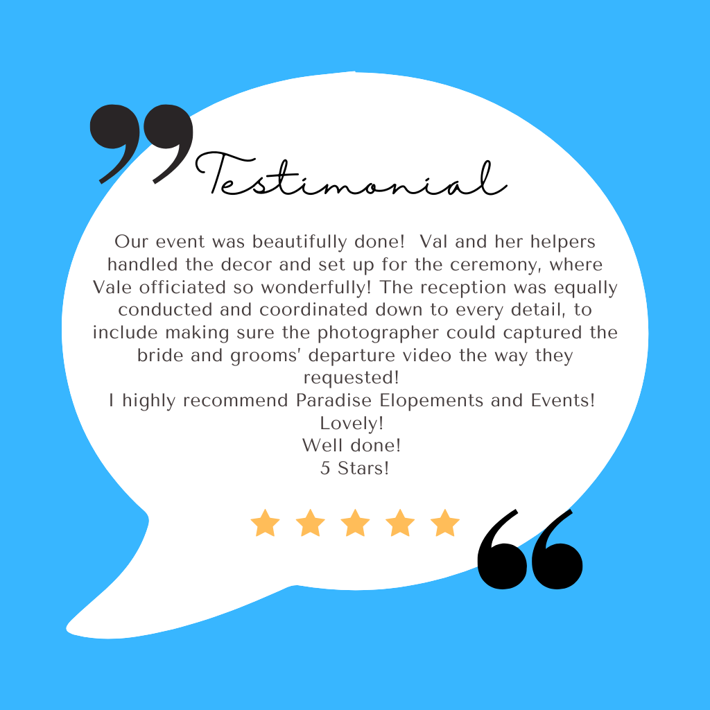 Let Paradise Elopements and Events help you create lasting memories on your special day. With our expertise and personalized touch, all you need is love—we’ll take care of the rest.